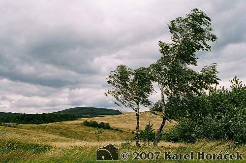 | 5.7.2007 Erbenova vyhlídka, Ústí nad Labem, poledne. Silný vítr krajinu jakoby učesával a tím jí propůjčoval neobvyklý zvláštní ráz. Canon EOS 1V, 24mm f/11, Kodak ProFoto 100. KLÍČOVÁ SLOVA: léto, louka, strom, vítr |