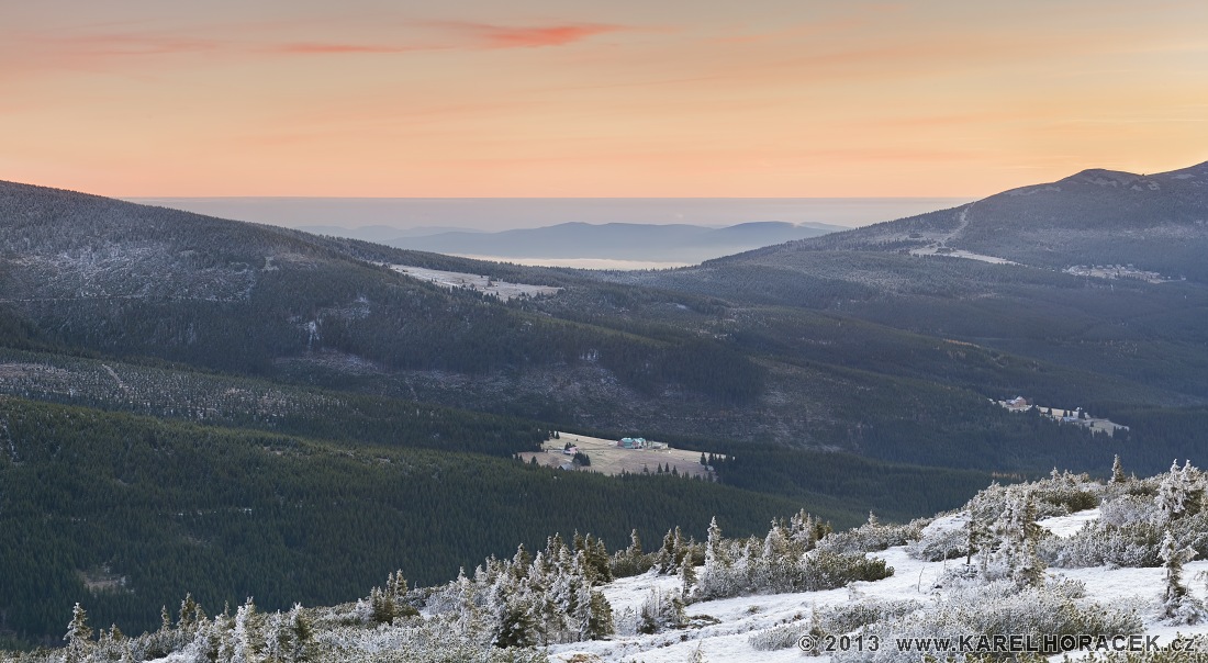| POLSKÁ BRÁNA Krkonoše • 12. listopadu 2013, 6:57 hod. PARAMETRY: vítr 2 km/h, teplota -5 °C, 6:57 hod. Canon 200 mm L II USM, f/8 @ 1/250 + 1/25 sec., ISO 6400 PANORAMA: 16329 x 9000 pixel složeno ze 17 snímků, 12x plošně ve 2 řadách, 2x expoziční bracketing Maximální tisková velikost tohoto obrazu je: 272 x 150 cm KLÍČOVÁ SLOVA: podzim, Krkonoše, kopec, kleč, stromy, Zlaté návrší, Špindlerovka, svítání, námraza, kameny, hory, hřeben, Polsko, inverze, obloha, cirry, sníh |