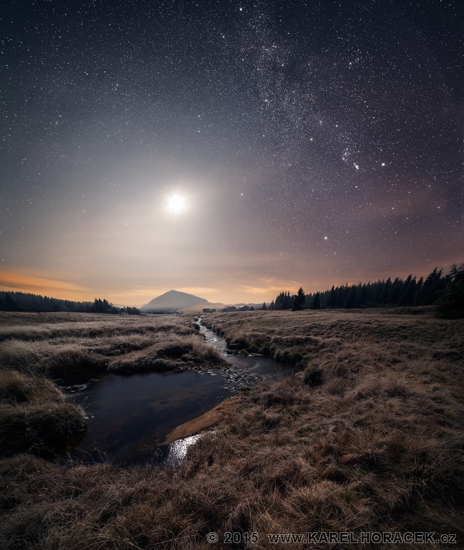 | ŘEKA ŽIVOTA Jizerské hory • 4. listopad 2015, 3:08 hod. PARAMETRY: bezvětří, teplota -13 °C 14 mm, f/5.6 @ 10x4 min ~ 9x2 min, ISO 1600 PANORAMA: 5613 x 6656 pixel složeno z 19 snímků, 2x plošně ve 2 řadách, 2x expoziční bracketing, 2 roviny ostření HVĚZDY: 8x 142 sec. KRAJINA: 4x 243 sec. + 6x 243 sec (nodální bracketing) 1x 121 sec. O FOTOGRAFII: Během tohoto focení jsem zažil zajímavý teplotní extrém. Během noci -13 stupňů pod inverzní čarou a o 6 hodin později +20 stupňů na hřebenu o 1100 m vedle. Připouštím, že na sluníčku. Ale bylo tak neskutečné vedro, že jsem musel do půl těla a krásné dopoledne jsem si tam užíval až do 11 hodin... Maximální tisková velikost tohoto obrazu je: 199 x 150 cm KLÍČOVÁ SLOVA: podzim, Jizerské hory, hory, hřeben, Bukovec, noc, hvězdy, Mléčná dráha, les, mlha, Měsíc |