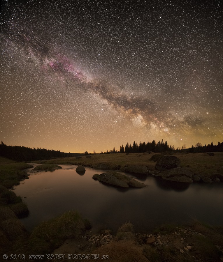 | LABUŤ KLESÁ NA PŘISTÁNÍ Šumava • 8. květen 2016, 2:17 hod. PARAMETRY: vítr 1 km/h, teplota 3 °C, 2:17 hod. Samyang 14 mm, PM, teplota čipu 17 °C PANORAMA: 5607 x 6594 pixel složeno z 20 snímků, 2x plošně ve 2 řadách, 2x expoziční bracketing HVĚZDY (1 řada): 13x 5 min. @ f/5.6 ISO 1600 + 1x temný snímek KRAJINA (1 řada): 4x 16 min. @ f/5.6 ISO 6400 + 1x temný snímek 1x referenční snímek O FOTOGRAFII Toto focení jsem is náramně užil. Přes den úmorná práce, přeházení 6 kubíků výkopku do 3kubíkové bikramky. Jak? Zprvu to vypadalo nemožně ... nakonec s větším množstvím vody a tloukem se zadařilo. Nákladní vůz to pak nemohl vytáhnout. :) Večer pak krásný relax u potoka. Bezvětří, chlad, ticho, úžasná pohoda. Maximální tisková velikost tohoto obrazu je: 150 x 176 cm KLÍČOVÁ SLOVA: léto, Šumava, noc, hvězdy, Mléčná dráha, tráva, voda, Roklanský potok, les, kámen |