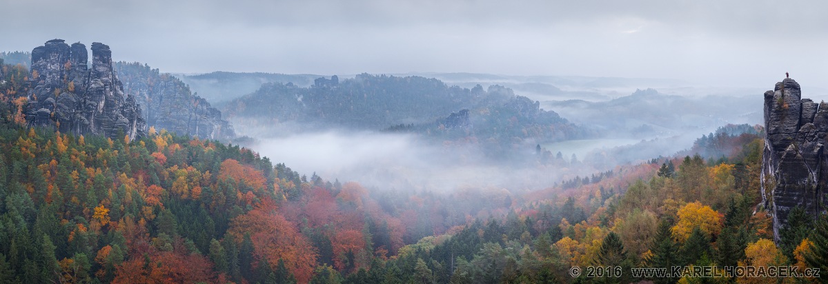 | FOTOGRAFOVA MELANCHOLIE České Švýcarsko 27. říjen 2016, 7:43 hod. PARAMETRY: vítr 3 km/h, teplota 6 °C, 7:43 hod. Canon 2/100, f/11 @ 20 sec., ISO 400 PANORAMA: 34751 x 11929 pixel složeno z 36 snímků, 36x plošně ve 3 řadách O VZNIKU FOTOGRAFIE: Jeden by si možná položil otázku, proč jsem tento obraz fotil jako třířad. A správně by udělal. Vždy říkám, že rozsáhlost panoramatu z pohledu skládání, určují 2 protichůdné parametry, a to tam, kde se protnou. Rozsáhlost by měla být jednak přímoúměrná výjimečnosti fotografické scény - čím lepší, tím vyšší "péči" si fotografie zaslouží a nepřímoúměrná dynamice podmínek - čím prchlivější, tím méně času máme na snímání. Podmínky tohoto rána zrovna dvakrát nepřály a bylo jasné, že další motivy se nedostaví. Snímat "složitě" byla jediná možnost, jak vyplnit čas :-))). Maximální tisková velikost tohoto obrazu je: 300 x 103 cm KLÍČOVÁ SLOVA: podzim, Saské Švýcarsko, mlha, inverze, les, skála, údolí |