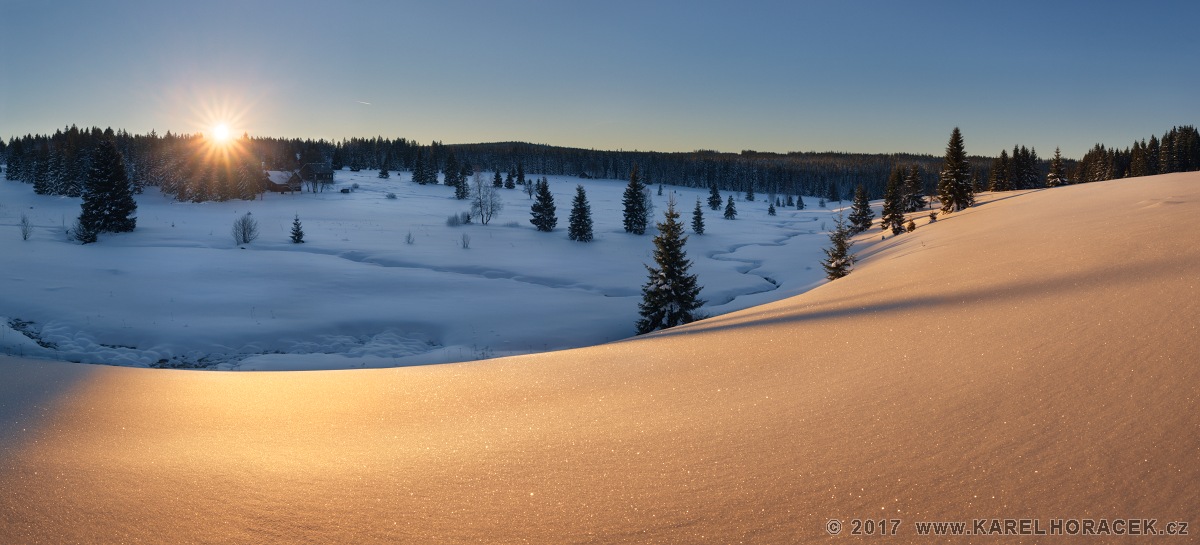 | ZLATÉ PÍSKY U MODRÉ LAGUNY Šumava • 21. leden 2017, 8:43 hod. PANORAMA: 12242 x 5564 pixel složeno z 12 snímků, 4x plošně v 1 řadě 3x expoziční bracketing, 3x antireflex vítr 2 km/h, teplota -6 °C, 8:43 hod. Zeiss 2/35, f/11 @ 1/640 + 1/160 + 1/40 s, ISO 100 O VZNIKU FOTOGRAFIE: Tento výjezd na Šumavu nebyl fotograficky úspěšný, noc stála povětšinou za prd, ráno bylo o chlup lepší. Co bylo "osvěžující"? Řekl bych snad noční zážitek nefotografického charakteru, k němuž dopomohlo nedodržení pomyslného desatera pro výběr vhodné večeře před nočním fotografováním. Nočních -18 stupňů onomu zážitku nepřidalo a pocit vnímání jeho skutečných 15 minut délky proudloužilo minimálně na dvojnásobek :) :) :) Maximální tisková velikost tohoto obrazu je: 300 x 136 cm KLÍČOVÁ SLOVA: zima, Šumava, sníh, meandr, stromy, slunce, svítání, huť, třpyt, ráno, stín |