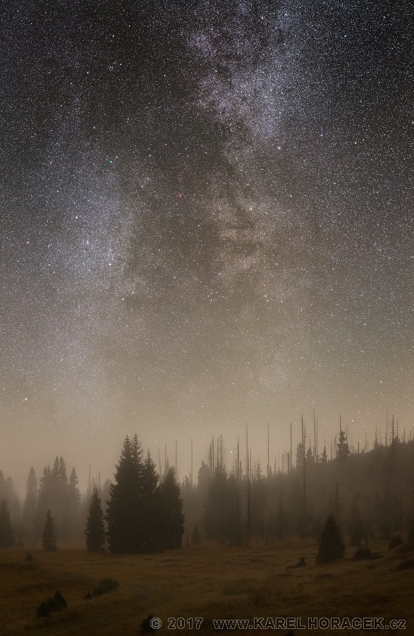| GALAXIE NAD BLATY Šumava • 14. říjen 2017, 23:36 hod. PANORAMA: 5474 x 8400 pixel složeno z 22 snímků, 3x plošně ve 3 řadách 2 řady obloha + 1 řada krajina, 2x exp. BKT, 2 roviny ostření OBLOHA: 2x 8x f/5.6 @ 303 sec., ISO 2000 + 1x DF KRAJINA: 1x 4x f/5.6 @ 607 sec., ISO 3200 + DF Canon 2/100 bezvětří, teplota 5 °C, čip 17 °C O FOTOGRAFII: Přibližně v místě levého horního zlatého řezu je viditelný zelený puntík. Při zpracování fotografie jej vidím a v duchu si říkám, sakra, co to je? Divný kaz, odpovídám si... Jelikož jsem oblohu fotil pro účely stackingu vícekrát, koukám na další snímky a "zelený puňťa" byl všude. Jdu hledat do hvězdných map a on to vesmírný objekt. Trochu zklamán, že to není UFO :). Jedná se o mlhovinu Činka, pojmenovanou po svém tvaru a označenou jako M27 či NGS 6853. Je vzdálená přes 1200 světelných let, tedy relativně blízko a její úhlová velikost je přibližně 6x8 minut. Na snímku v plném rozlišení je velká okolo 26x33 pixel, viz 100% crop zde. Už po příjezdu na místo okolo 18. hodiny se nad krajem snášela mlha a začala mě pronásledovat obava, co tam budu celou noc dělat, když se vše tak brzy halí do neprůhledné bílé. Naštěstí to bylo velmi lokální a přízemní, a to právě díky nedalekým blatům za kopcem (vlevo Vrchovisko, vpravo Březová slať) a Březovému potoku. Podmínky jsem využil pro tuto kompozici, kdy mlžný les jemně přecházel ve hvězdné nebe. Mlha, díky svému původu, cyklicky řídla a houstla, a proto byl trochu problém s dlouhými a násobnými expozicemi. Před začátkem snímání, jsem kvůli ostření musel 4x běžet do lesa, abych 2x pověsil čelovku na strom :) :) :). Po půlnoci se jak zázrakem klimatické podmínky změnily, extrémně klesla vlhkost a vzduch byl křišťálově čistý. Maximální tisková velikost tohoto obrazu je: 150 x 230 cm KLÍČOVÁ SLOVA: podzim, Šumava, les, tráva, noc, hvězdy, Mléčná dráha, mlha, Činka, mlhovina, M27, NGS 6853 |