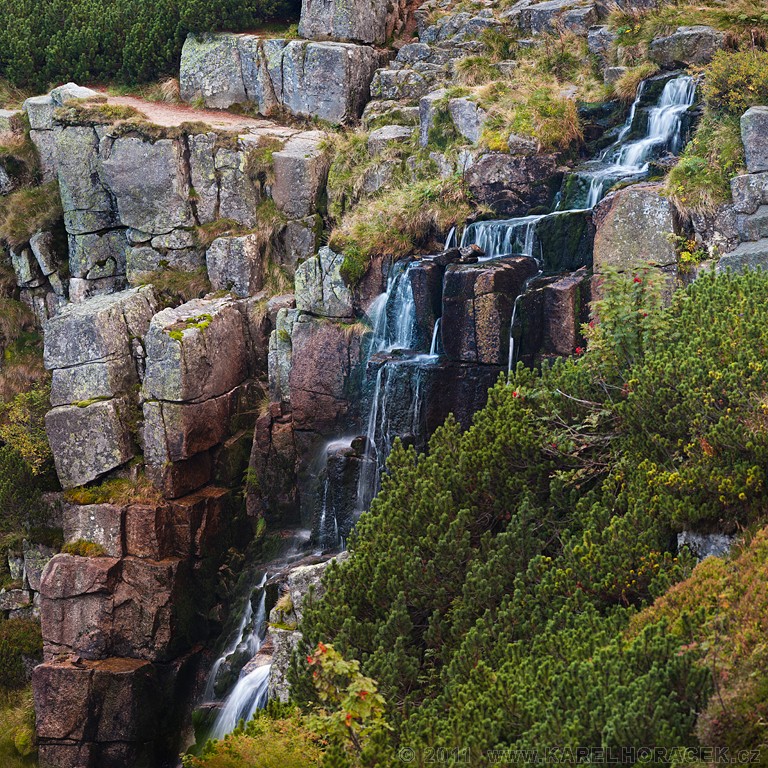 Fotografováno z necelých 100 metrů severně vzdáleného skalního výchozu. Fotoaparát byl usazen na jediném trochu volném místě, kde překážel jen 5 cm tlustý jeřáb obalený jeřabinami. Strom jsem proto ohnul do napruženého stavu a zajišťoval jednou rukou, čímž jsem vytvořil jistý katapult, jehož odpalovací vektor pro celou fotosoustavu směřoval do Labského dolu pode mnou. :-) Druhou rukou jsem se věnoval fotografování a panování.