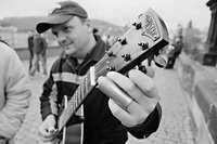 hudební CD, včetně jednoduchého bookletu. U CD jsme se dohodli, že bude v rozsahu potisku CD média, zadní obal do krabičky a čtyřstránkový booklet se stručnými medailonky Matěje a Luboše na vnitřních dvou stranách. Vše mělo být pojato černobíle. Vybral jsem několik variant fotografií pro jednotlivé plochy a z nich postupně ty konečné tak, aby použitý materiál byl vyvážený nejen graficky, ale také obsahově vzhledem k oběma hudebníkům. Při závěrečném posuzování hotového návrhu jsme nakonec změnili titulní obal na sólovou Matějovu fotografii místo původně společné s Lubošem. Důvodem byla jeho četná vystoupení i s jinými kytaristy, při kterých CD prodává. Nejednalo se ovšem o jedinou změnu v rámci dolaďování. Existovalo mnoho aspektů, a to důležitých, které jsme chtěli všichni tří u výsledného obalu zachovat. Ne vždy lze jít ale kompromisem, a tak některé musely poodstoupit do pozadí. Byla to skvělá spolupráce a vzájemně jsme se doplňovali a "hlídali". Jedním aspektem byla určitá místní, a troufám si říci i časová, anonimita. Chtěli jsme, aby z obalu nebylo na první pohled zřejmé, že se jedná o Karlův most v současné době. A právě zde jsme museli slevit, například pokud na obalu měla být i fotografie s posluchači, lidmi na ulici, kteří k blues na ulici neoddělitelně patří. Byli zde moderně oblečeni. A vždy budou. Fotografii aranžovanou jsme všichni jednohlasně odmítli, protože by se nejednalo o skutečný autentický záznam, kdy Matěj s Lubošem hrají. |