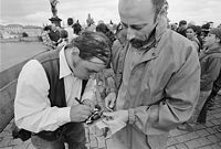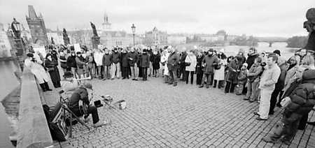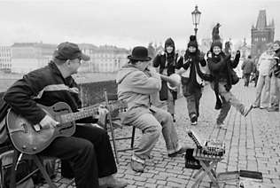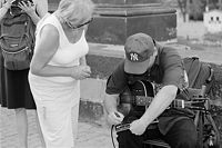 | Také se jednalo o oblíbenou fotografii Luboše Beňi, kterému se líbila akční zvídavost pána, jak nakukuje do plechovky, kolik tam je peněz (nejspíše). O nekolik vteřin po mém stisku spouště tam vhodil pár mincí. |